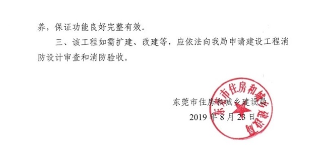 本工程已于8月29日順利拿到《建設(shè)工程消防驗(yàn)收意見(jiàn)書(shū)》東建消驗(yàn)字【2019】第0248號(hào)。